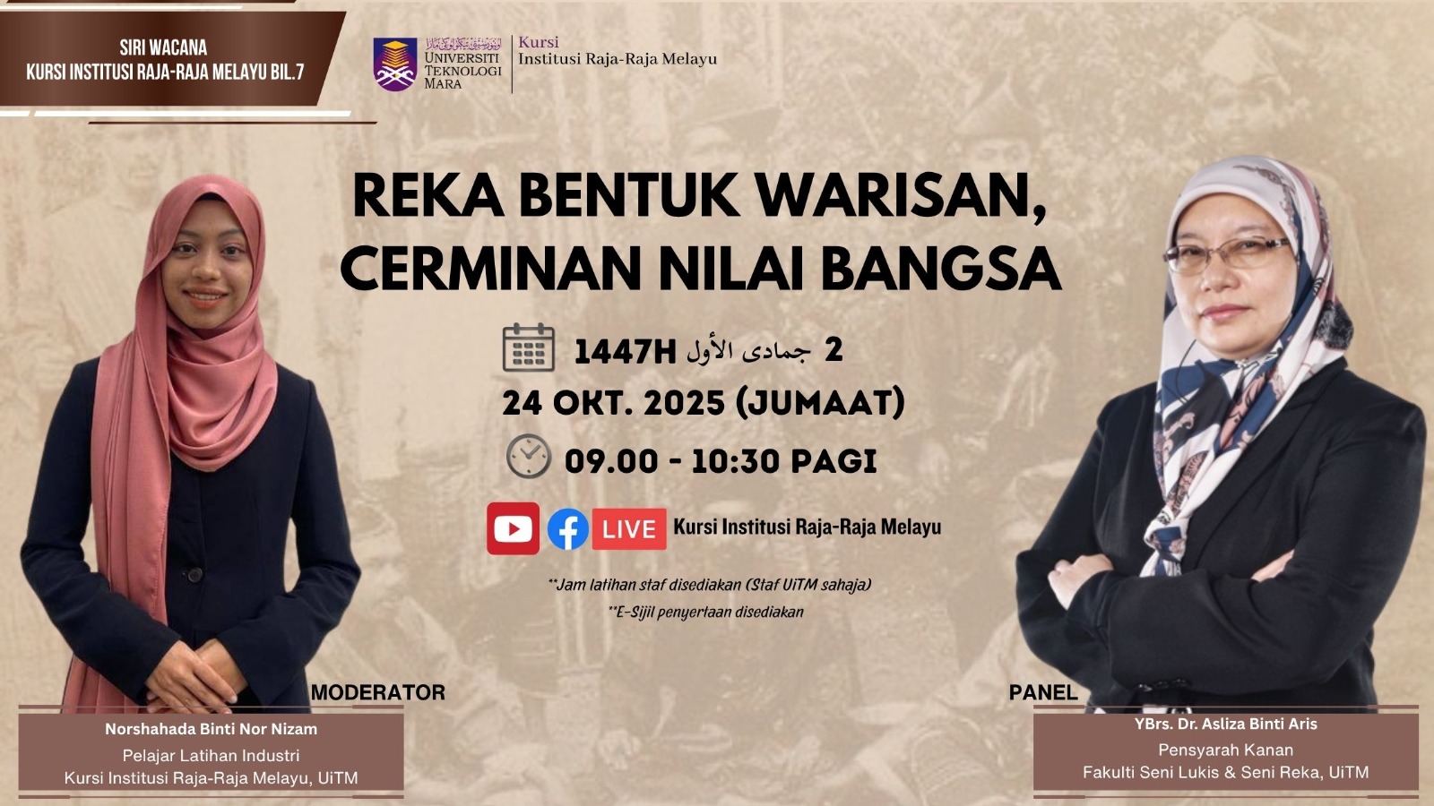 Aris, Asliza (2025) Siri Wacana Kursi Institusi Raja-Raja Melayu UiTM Bil. 7 : Reka Bentuk Warisan, Cerminan Nilai Bangsa. [Video]